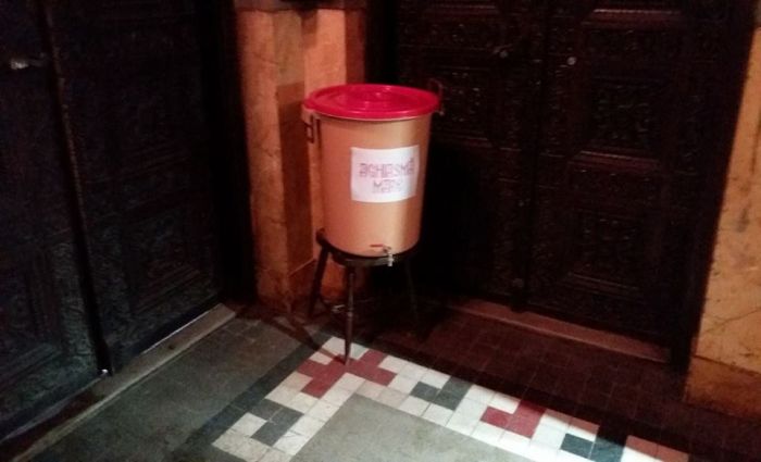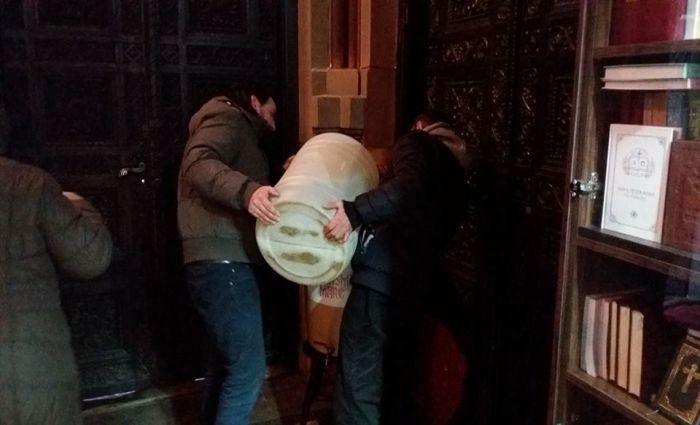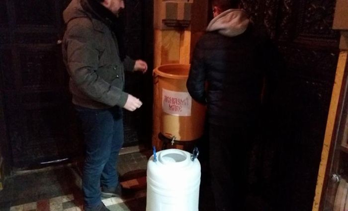 Butoaiele cu apa sfintita au fost puse in holul Catedralei, iar sute de credinciosi au format deja randuri si asteapta sa primeasca Aghiasma Mare.