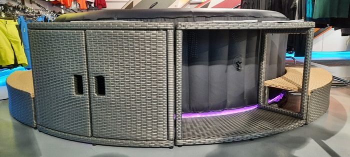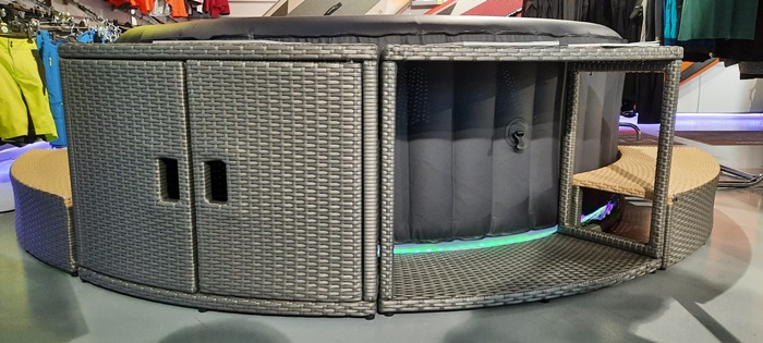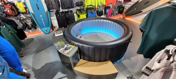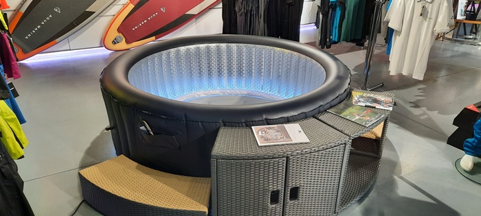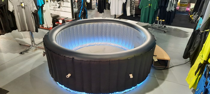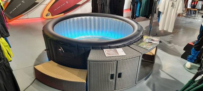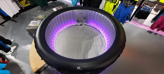 “Este un jacuzzi care este foarte mic, este gonflabil. Poate fi montat in curte sau pe terasa. Se umfla singur cu ajutorul unei telecomenzi cu diferite functii. Cu acest dispozitiv putem seta temperatura, sa se incalzeasca cand dorim. Putem sa dam drumul la jeturi pentru hidromasaj. Avem diferite marimi si culori, iar unele jacuzzi-uri vin si cu benzi cu leduri. Si acest jacuzzi poate fi strans si pus intr-o geanta, fara a ocupa prea mult loc“, explica Octavian Iancu, manager showroom Fischer Timisoara.