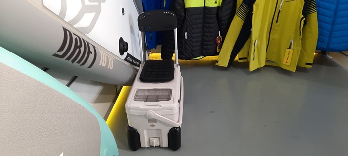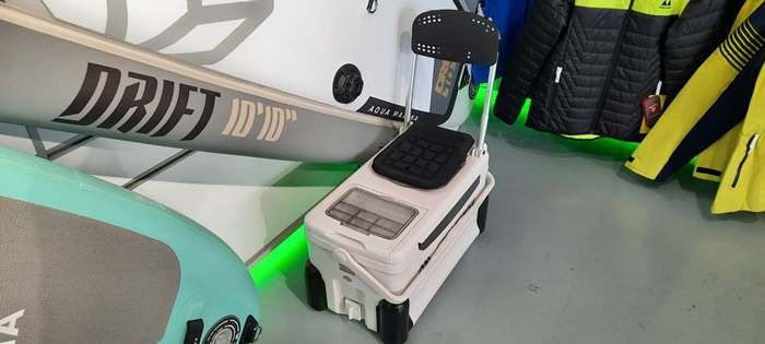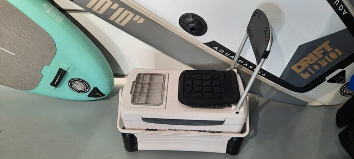 Avem si SUP-ul special pentru pescuit, unul foarte stabil. Acesta vine si cu un scaun special pentru pescuit, care are inauntru o lada frigorifica, si pe placa se pot monta si elemente pe care sa poata fi fixate lansetele…