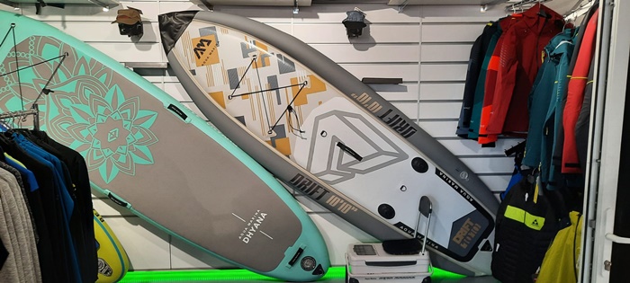 “Este vorba despre brand-ul Aqua Marina. Ei se ocupa in principal cu stand-up-ul paddle-uri. Aici gasim o gama variata de SUP-uri. Gama all around este o gama ce poate fi folosita pe orice apa, puteti iesi pe un lac sa va relaxati, sa il luati in vacanta, merge chiar si pe rauri repezi. Ei au SUP-uri si pentru touring, adica puteti merge cu ele pe distante mai mari. Au o forma aerodinamica mai speciala si asta le si da o viteza mai mare, iar cel care vasleste nu oboseste atat de repede. Avem si SUP-uri pentru copii, care sunt putin mai mici. SUP-urile sunt foarte rezistente, au perete dublu. De asemenea, pentru siguranta, este prinsa o lesa de picior, care este conectata la SUP, asa ca, daca pica in apa cel care se afla pe placa, nu se va pierde…