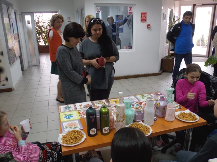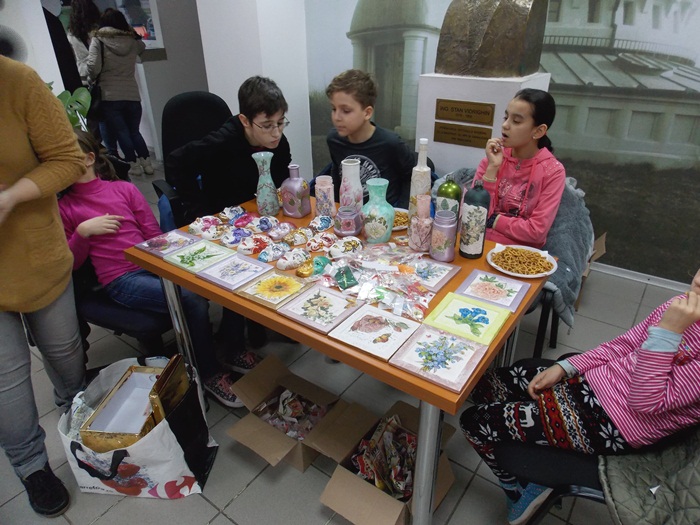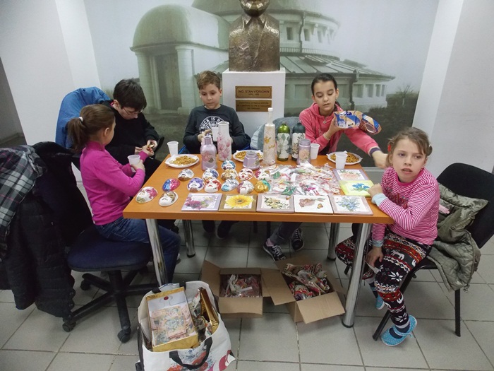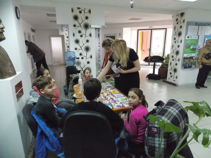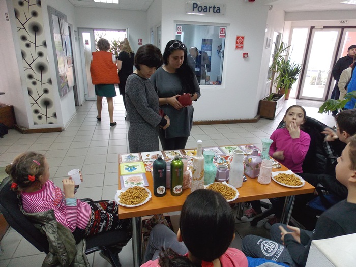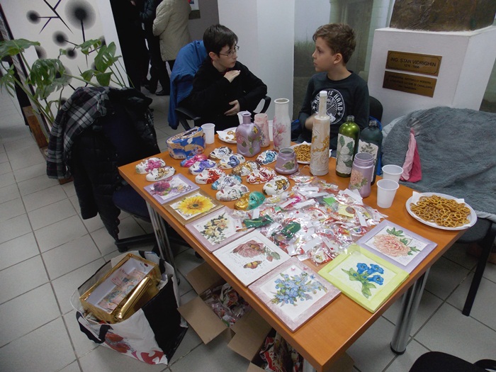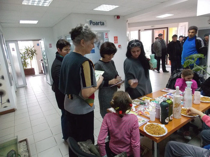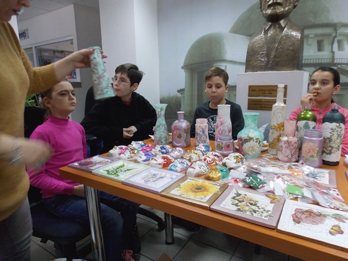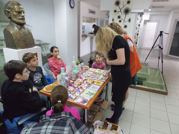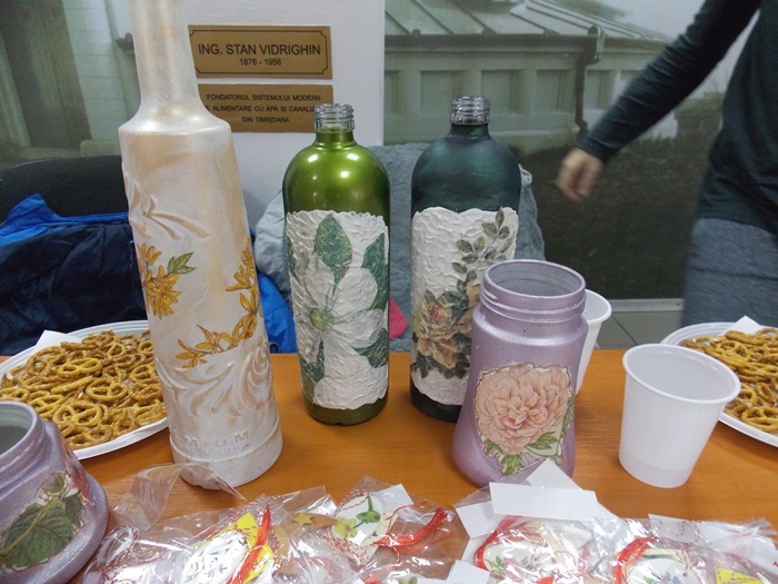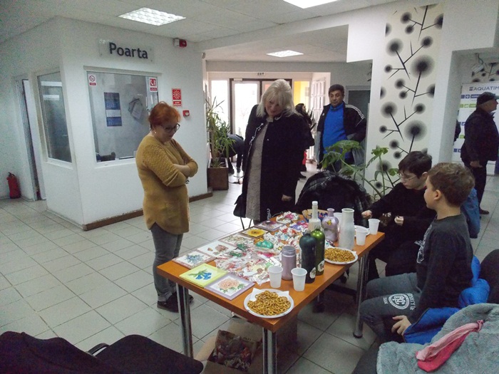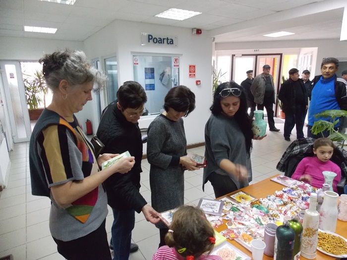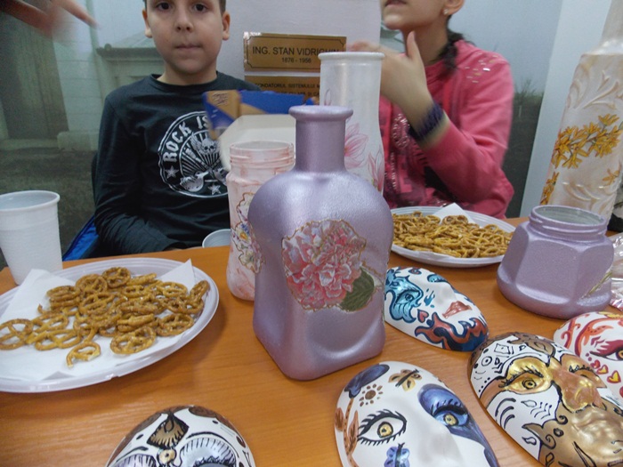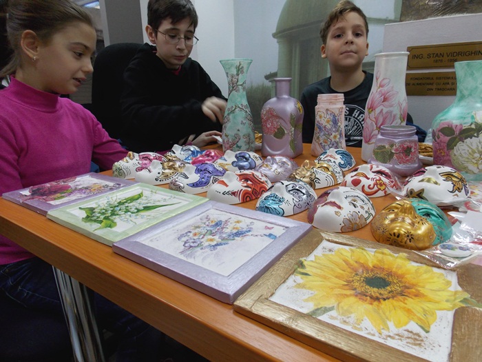 Cinci copilasi de la Centrul “Constantin Pufan” din Timisoara au venit in vizita la compania de apa canal, pentru a le vinde angajatilor propriile creatii. Masti pictate dupa modelul celor din carnavaluri, picturi pe sticle de diferite marimi, dar si mici tablouri, toate cu motive de primavara, au fost puse pe o masuta pentru a fi admirate si cumparate de doritori.
