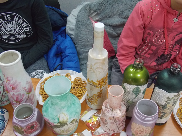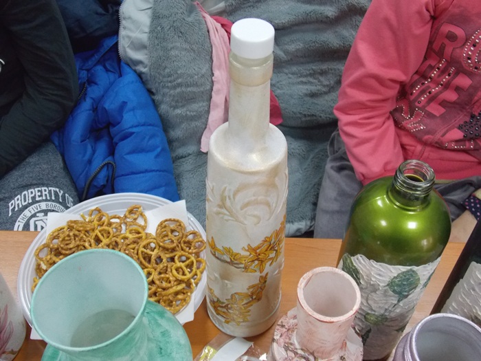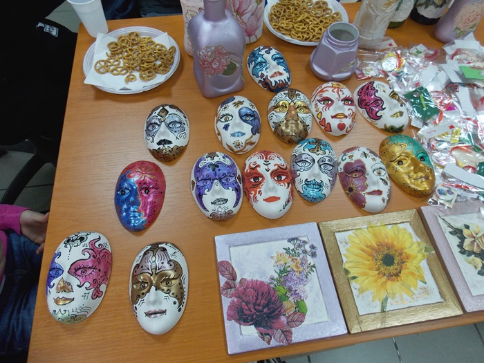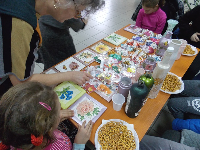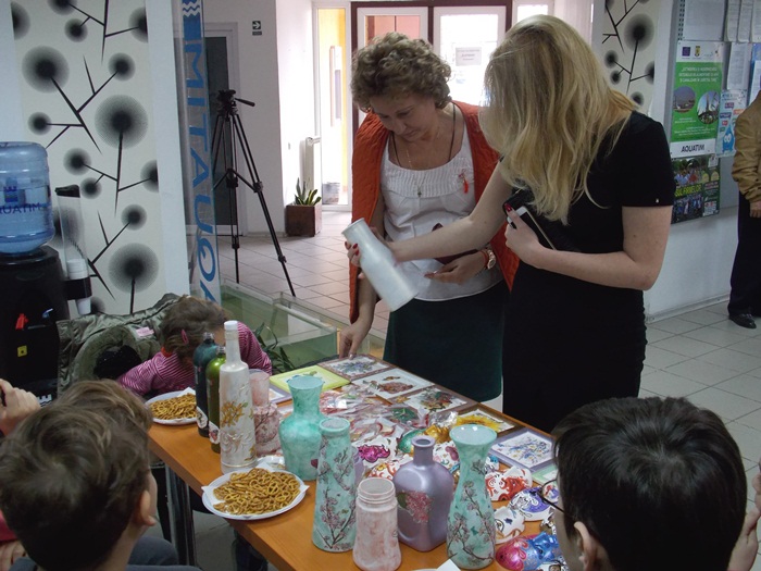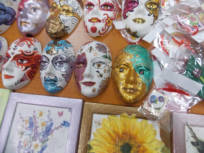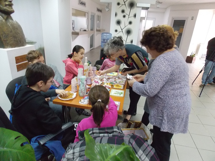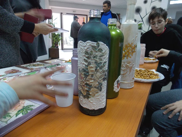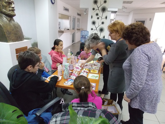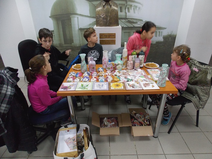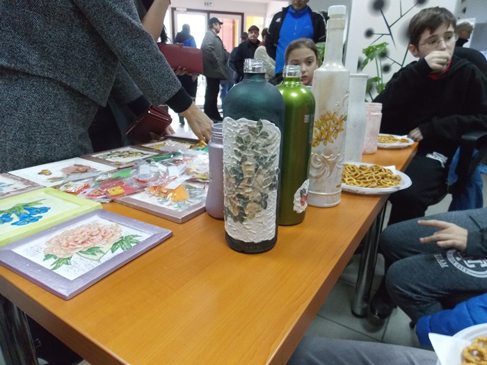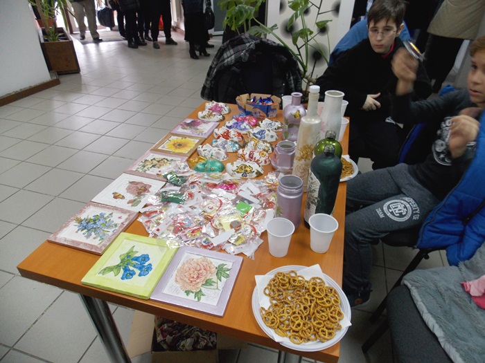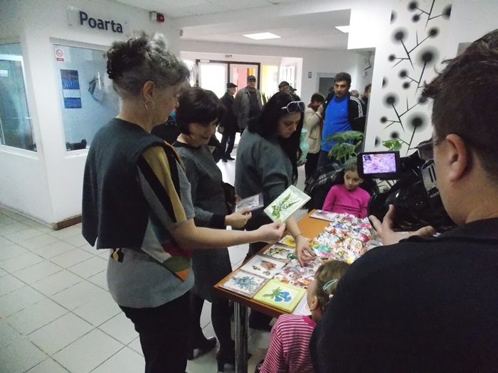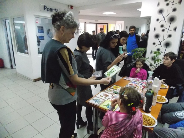 Cinci copilasi de la Centrul “Constantin Pufan” din Timisoara au venit in vizita la compania de apa canal, pentru a le vinde angajatilor propriile creatii. Masti pictate dupa modelul celor din carnavaluri, picturi pe sticle de diferite marimi, dar si mici tablouri, toate cu motive de primavara, au fost puse pe o masuta pentru a fi admirate si cumparate de doritori.