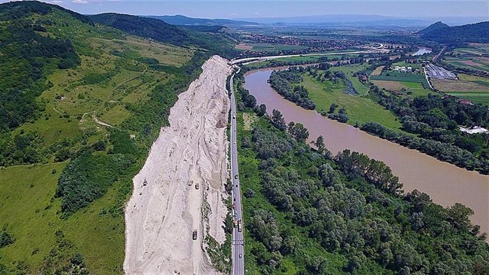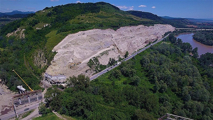 “Asa arata de la inaltime zona vestitului deal “al liliecilor”, parte din lotul 4 al Autostrazii A1 Lugoj-Deva. Imaginile surprind capatul de vest al versantului, acolo unde se construieste un viaduct cu 6 deschideri peste calea ferata (CF209), DN76 si DJ706A.