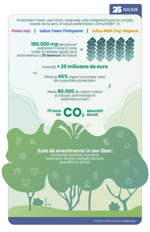 Opt proiecte regionale, cu o suprafață totală de retail de 320.000 mp, peste 1.000 de branduri internaționale și românești și mii de evenimente organizate, acestea sunt cifre-bilanț ale grupului IULIUS, care aniversează, anul acesta, 25 de ani de la inaugurarea primului mall din afara Capitalei, la Iași. În această perioadă, compania a demonstrat că este mai mult decât un dezvoltator de real-estate și operator al proiectelor sale, ci un pionier în generarea de experiențe pentru comunitate, care contribuie activ la dinamizarea vieții urbane din Iași, Cluj-Napoca, Timișoara și Suceava. Anual, proiectele IULIUS au peste 73 de milioane de vizite, performanță susținută de funcțiunile multiple ale dezvoltărilor – retail, office, parc, entertainment –, care au devenit destinații urbane datorită experiențelor variate pe care le oferă.
