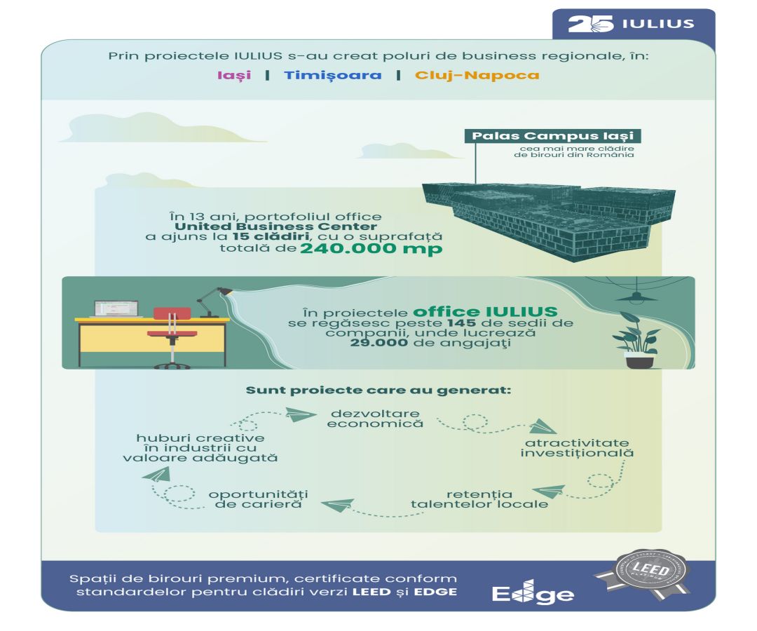 TIMISOARA. Anul acesta, compania IULIUS aniversează 25 de ani de la inaugurarea primului proiect real-estate modern și marchează un moment definitoriu în evoluția dezvoltării urbane în Iași, Timișoara și Cluj-Napoca, subliniind impactul major al portofoliului său de clădiri office asupra economiei locale. Sub brandul United Business Center (UBC), IULIUS a transformat centrele acestor orașe în adevărate huburi de business, prin dezvoltarea a 240.000 mp de spații office premium, integrate în proiecte mixte. Comunitatea UBC a ajuns la 145 sedii de companii, multinaționale și naționale, din domenii cu plus-valoare, unde lucrează 29.000 de angajați. Tot compania IULIUS a inaugurat la Iași, în 2023, Palas Campus, cea mai mare clădire de birouri din România (60.000 mp).