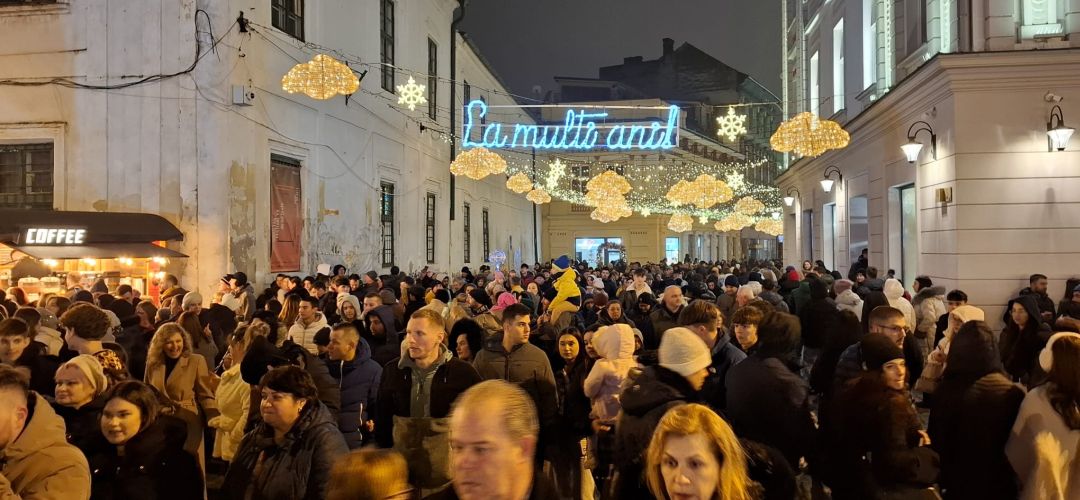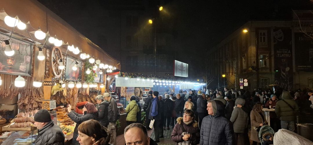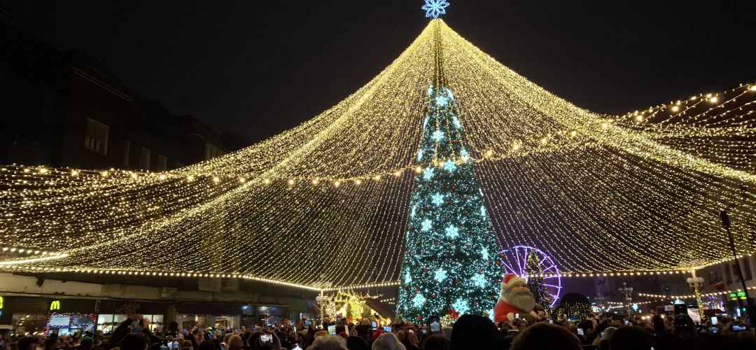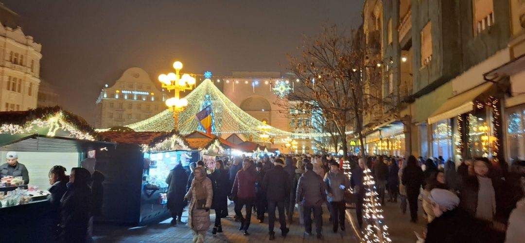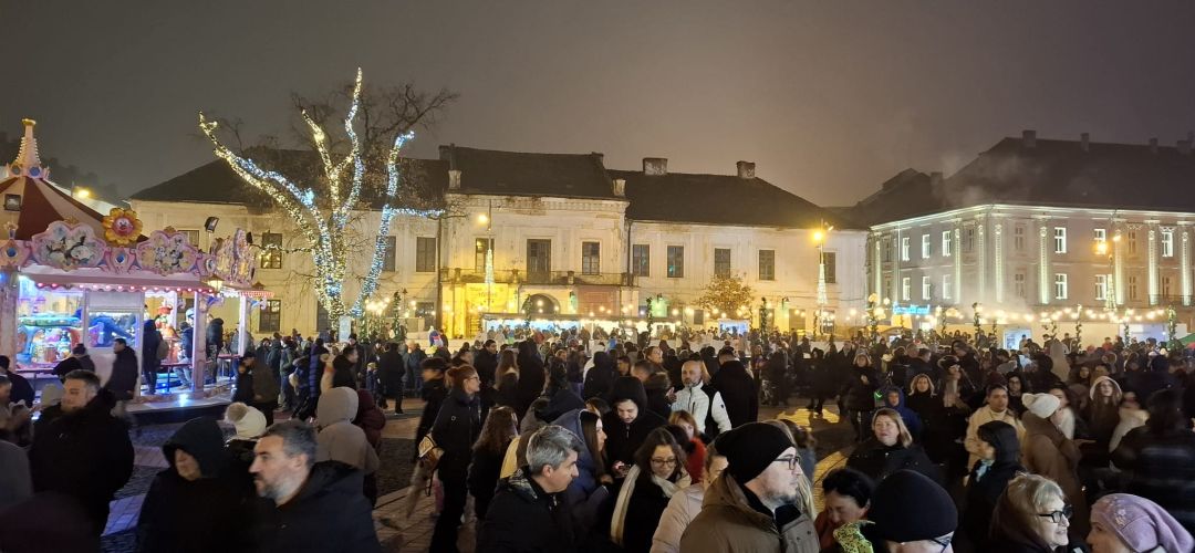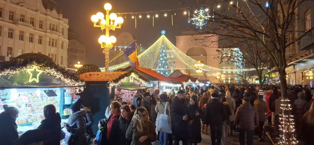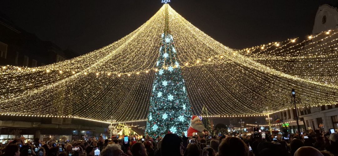 S-a deschis Târgul de Crăciun, mii de luminițe au fost aprinse, iar atmosfera e întreținută de Ștefan Bănică Jr. și orchestra.
