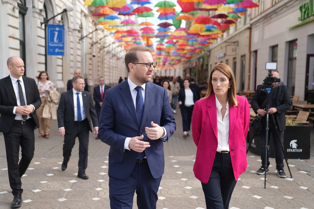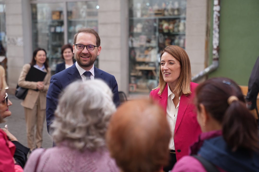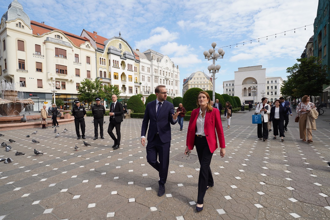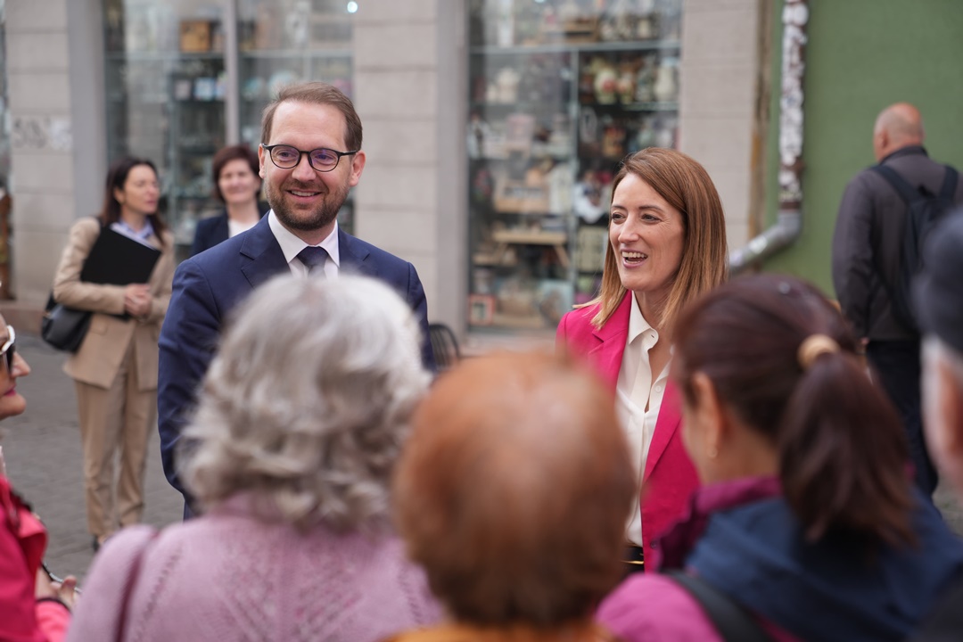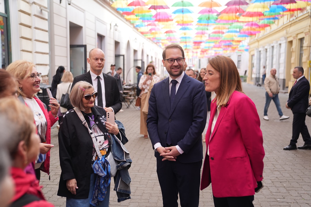 Dimineata, presedintele Parlamentului European a facut o scurta vizita prin centrul Timisoarei, insotita de primarul Dominic Fritz, si a stat de vorba cu timisoreni aflati pe strada.