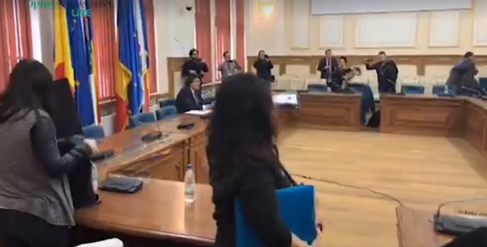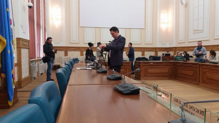 Reprezentanti de la toate publicatiile, site-uri de stiri, radio si TV, au venit la conferinta saptamanala de presa a edilului, insa s-au ridicat si au parasit sala in momentul in care primarul a inceput sa vorbeasca in fata telefonului mobil cu ajutorul caruia isi transmite pe Facebook monologul , lasandu-l sa fie in continuare, asa cum pretinde, ‘cel mai tare organism de presa din Timisoara’.