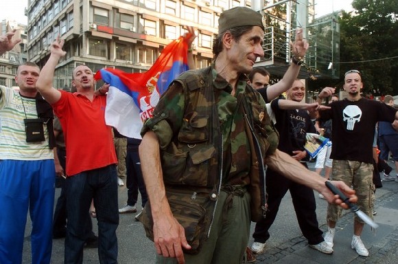 Protestatarii au rasturnat containere cu gunoi si au scandat „Cutit, sarma, Srebrenita” – aluzie la masacrul de la Srebrenita. Ei au chemat la „rascoala” in Serbia.