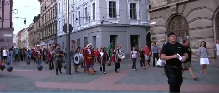 Intreaga parada a fost insotita de cimpoaiele Peregrinilor, dar si de zeci de timisoreni dornici sa intre in atmosfera din alte vremuri. Ajunsi in piata, razboinicii au facut demonstratii de manuire a sabiilor.