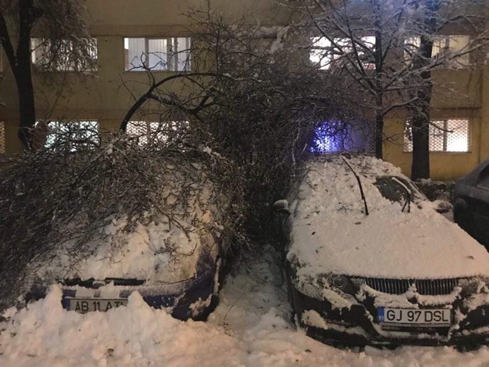Zeci de copaci s-au rupt la Timisoara sub greutatii zapezii si au cazut peste masinile lasate de proprietari in parcari sau pe marginea soselelor. Parbrize crapate sau plafoane indoite ori alte avarii ii vor face pe proprietari sa cheltuiasca sume insemnate pentru repararea autoturismelor.