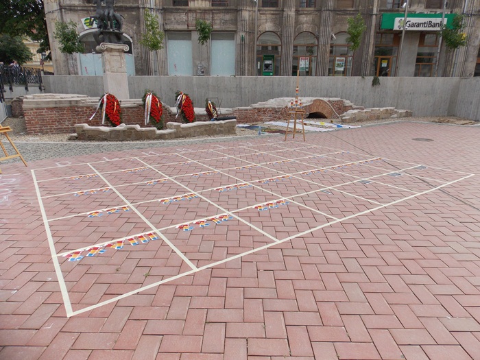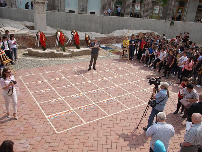 La orele pranzului, joi, angajatii Bibliotecii Judetene Timis ‘Sorin Titel’ au ‘desenat’ pe pavajul din Piata Sfantu Gheorghe o fila de calendar din luna aprilie 1918, Anul Marii Uniri.