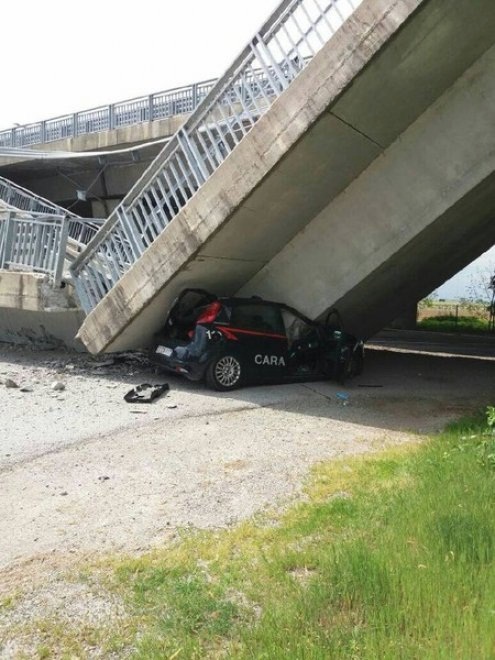 Surprinzator poate, dar nu s-a intamplat in Romania. Evenimentul a avut in Italia, in apropierea unui orasel din zona Piemont. Pasarela facea legatura cu centura oraselului Fossano, care are regim de autostrada, si a cazut pe o masina a carabinierilor. Agentii au auzit zgomote si au reusit sa iasa inainte ca vehiculul să fie strivit. Nu au fost nici alti raniti, din moment ce nicio alta masina nu mai trecea in acel moment pe sub autostrada. Pasarela s-a prabusit numai pe un sens, pe celalalt circulatia desfasurandu-se normal.
