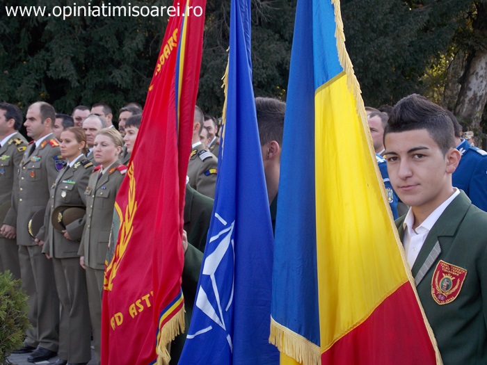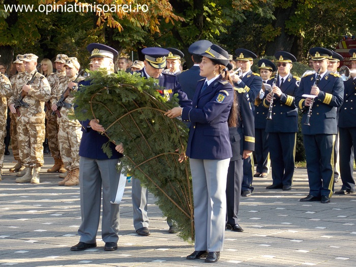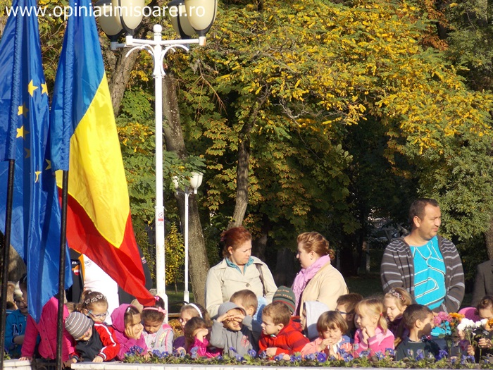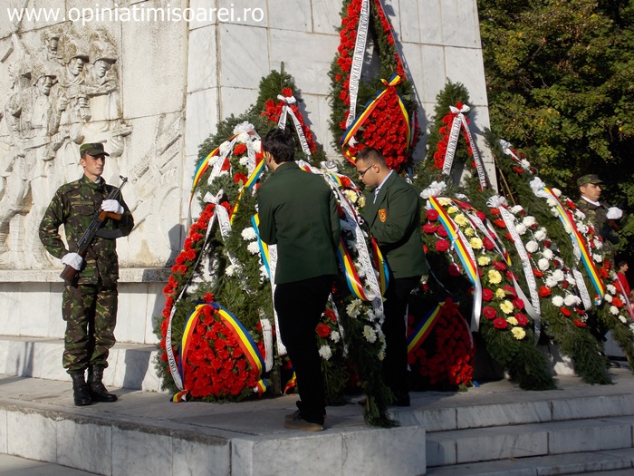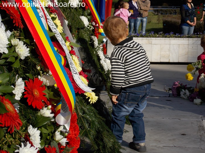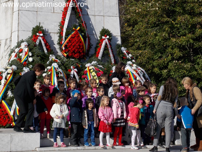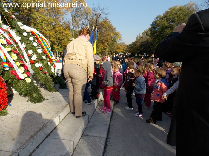 TIMISOARA. Traditionalelor depuneri de coroane le-au fost alaturate exercitii de maiestrie a manuirii armelor si momente artistice ale fanfarei. Sute de copii, de la prichindei de gradinitia si pana la liceeni, veterani de razboi sau simpli timisoreni s-au adunat in Parcul Central.