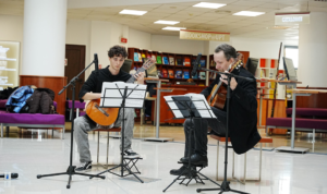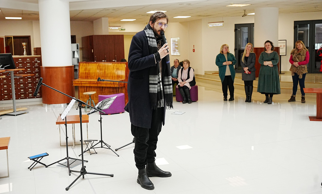 Primul eveniment al zilei a avut loc la Biblioteca UPT, unde comunitatea academică a fost invitată la un moment de „Chitară & Poezie”, organizat în holul central. Programul a inclus un recital de chitară susținut de Patrick Bîrlibescu și prof. Alexandru Crețescu, urmat de un recital de poezie în interpretarea actorului Cătălin Kopandi. Muzica și versurile au creat o atmosferă caldă și introspectivă, oferind participanților un prilej de a se opri, pentru câteva clipe, din ritmul cotidian și de a celebra frumusețea limbii și culturii române.