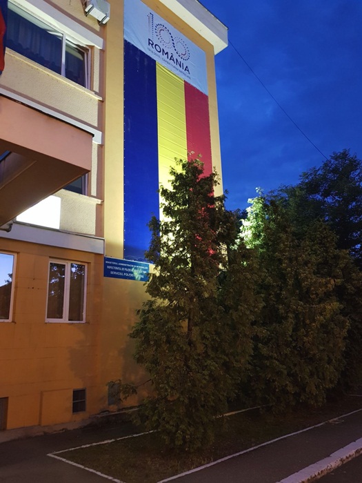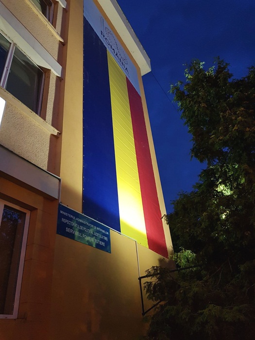 TIMISOARA. Cu cateva ore inainte de ziua de 26 iunie, cand sarbatorim Ziua Drapelului, Inspectoratul Judetean de Politie Timis a arborat un steag tricolor pe aproape toata inaltimea cladirii.
