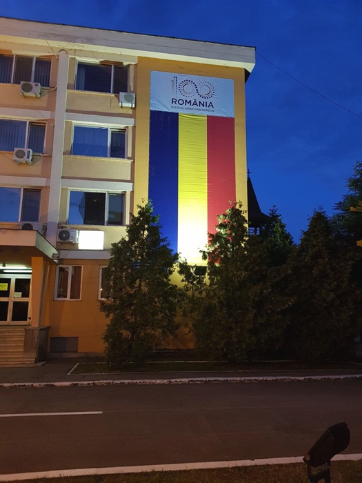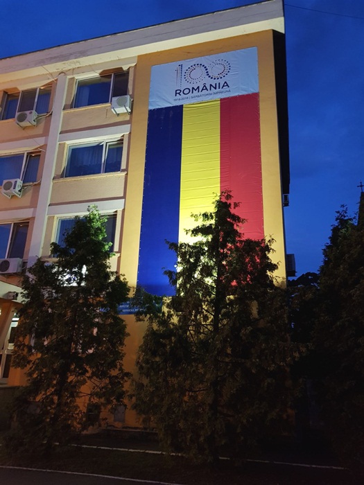 Steagul se intinde pe trei etaje, iar partea superioada este inscriptionata cifra 100 – care simbolizeaza Centenarul Marii Uniri.