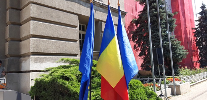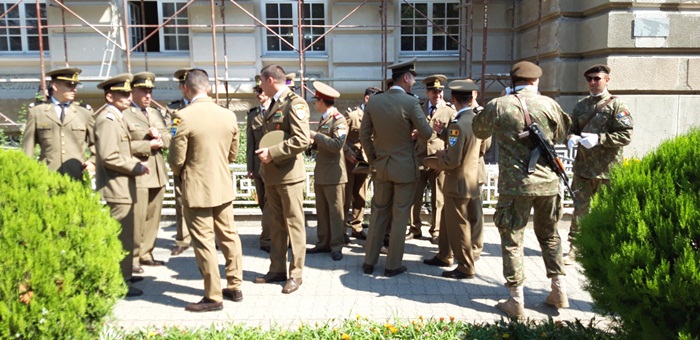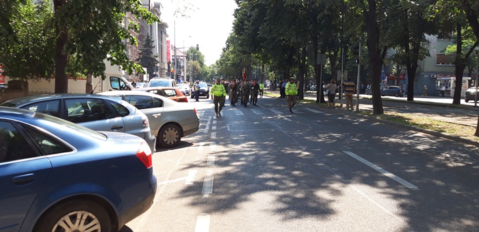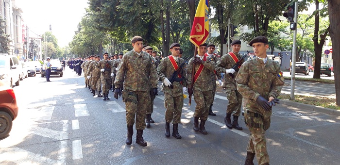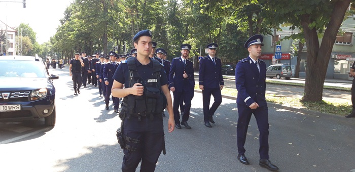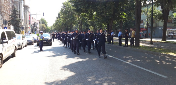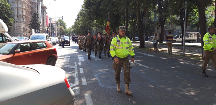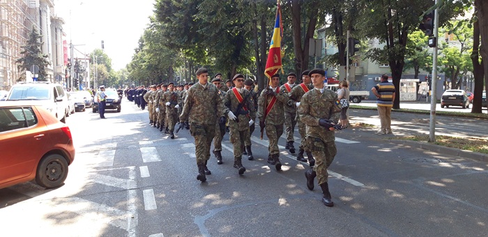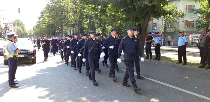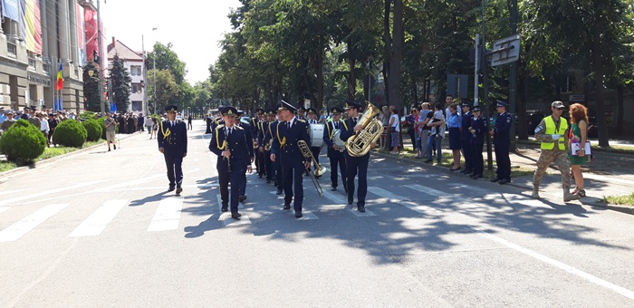 A urmat apoi defilarea plutoanelor de reprezenanti MApN, jandarmi si politisti, insotiti de muzica de fanfara, care au dat onorul tricolorului, la trecerea prin fata Palatului Administrativ.