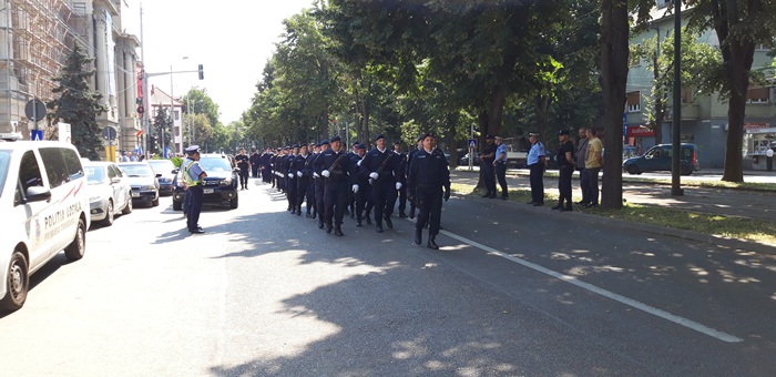 TIMISOARA. Aparatori ai patriei si ai ordinii publice au defilat prin fata Palatului Administrativ cu ocazia Zilei Drapelului National, la Timisoara.