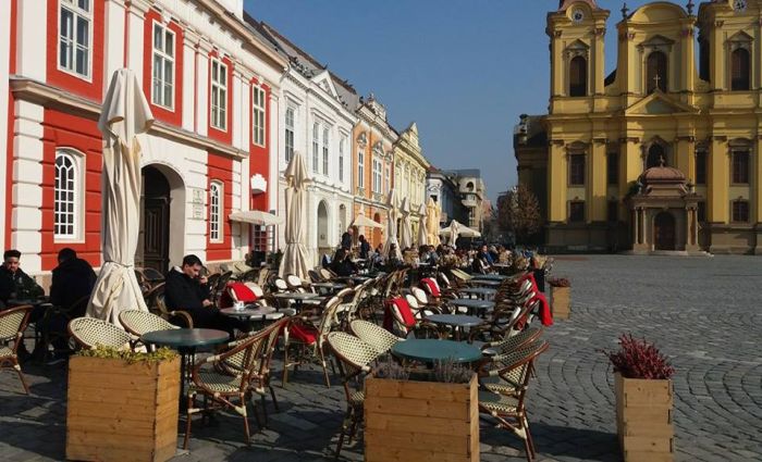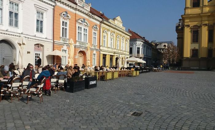 Sub un soare prietenos, proprietarii de terase s-au gandit sa profite de vremea frumoasa. Au scos mesele in fata localurilor din Piata Unirii, pe scaune au asezat paturi pufoase si i-au invitat pe trecatori sa se aseze la o cafea sau un ceai aromat.